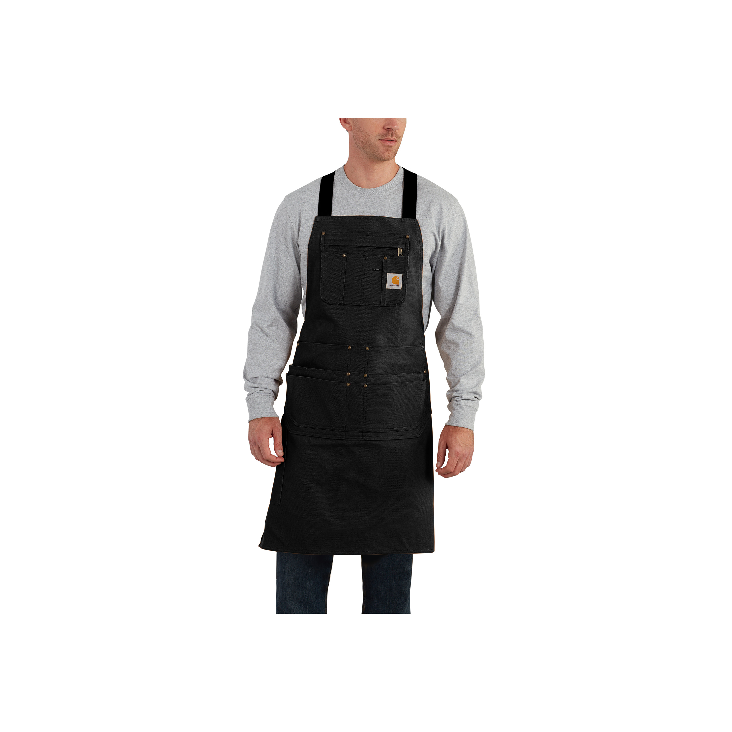 Slitstarkt Carhartt Firm Duck-förkläde i kraftig Firm Duck-canvas, utformat för dagligt arbete. Den justerbara Custom Fit-passformen med korslagda axelband ger hög komfort, medan de många fickorna – inklusive bröstficka med dragkedja – håller ordning på verktyg och utrustning. Trippelsydda sömmar säkerställer lång hållbarhet, även vid hård användning.